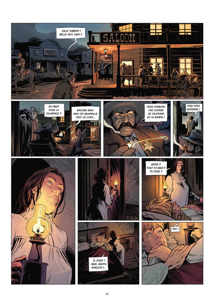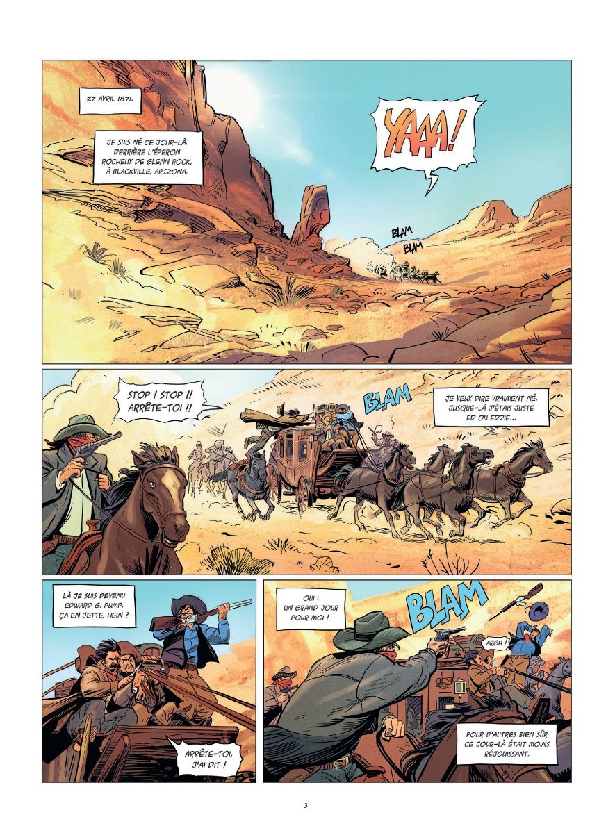 C'est la lecture d'une biographie de Donald Trump et ses origines allemandes qui a donné l'idée à Nicolas Anspach de ce western atypique ! En effet, l'ancêtre de l'actuel président des Etats-Unis était propriétaire d'un saloon proposant breuvages, nourriture et "compagnie" féminine en 1897. Le directeur de la maison d'édition belge ne voit personnes d'autres que le scénariste Rodolphe ayant déjà réalisé Trent (Dargaud) un western canadien, ainsi que son compère dessinateur Laurent Gnoni avec qui il avait travaillé sur Naufrageurs (Daniel Maghen) . Le projet est né, mais ne pouvant le nommer "Trump"pour des questions de droits évidentes, ils affublent cet anti-héros du nom de Pump ! Vous pouvez maintenant plonger en Arizona au printemps, en pleine attaque de diligence où l'unique survivant se trouve être une ravissante tête blonde aux yeux bleus nimbés de mystères. Sauvé par la troupe du shérif de la ville voisine, il récupère bien à l'abri et saisit l'opportunité de changer de nom en "empruntant" celui d'un neveu nommé Pump. A force de mensonges et de manipulations en tous genres, il va gravir les échelons, à commencer par le saloon dans lequel il trouve un travail d'homme à tout faire. Sa voix-off nous accompagne et nous informe de ses envies et manigances pour arriver à ses fins. Usant de son visage d'ange et son charme naturel, il séduit et entourloupe tout ce petit monde, saisi par une ambition démesurée ! Une ascension foudroyante qui peut s'avérer fatale lorsque les masques tombent, attention Edward G. Pump ! Pour illustrer ce western fascinant, le trait de Laurent Gnoni fait des merveilles ! Son dessin réaliste est précis, détaillé, le tout dans une atmosphère sulfureuse avec des jeux d'ombres et lumières du plus bel effet. Un thriller au far-west avec une fin ouverte et intrigante au possible, un héros autant fascinant que détestable, que peuvent nous réserver encore ce duo d'auteurs de grand talent ?? A suivre...