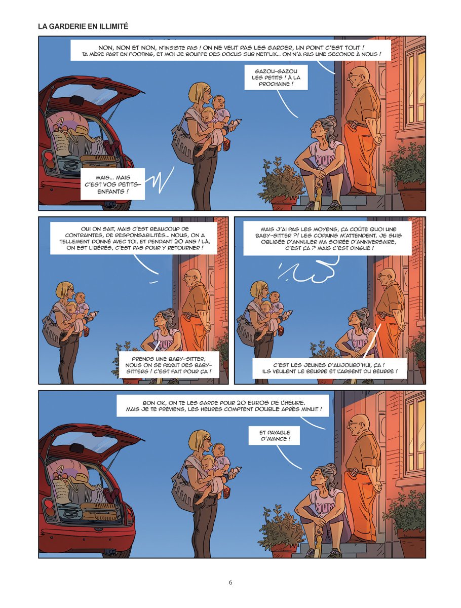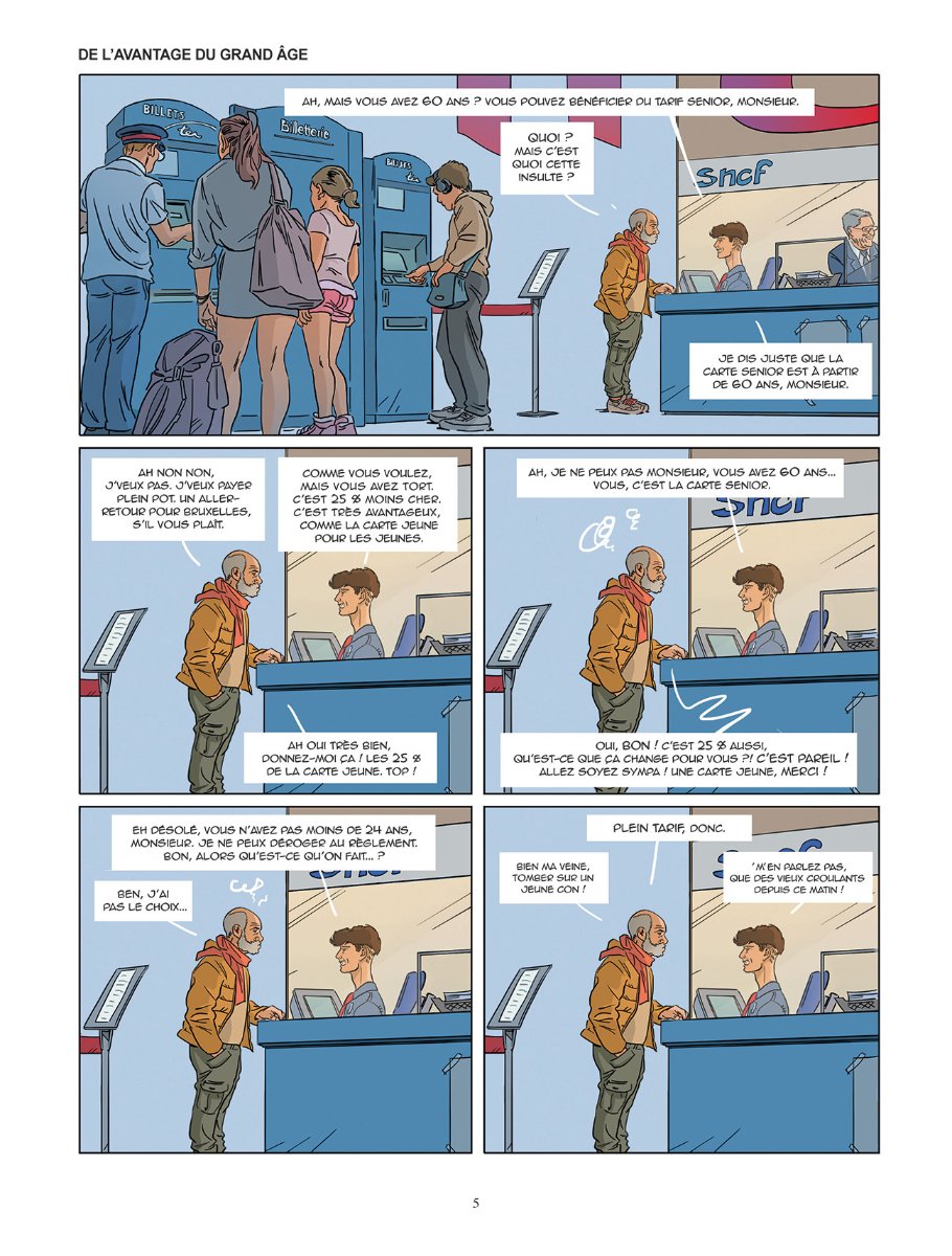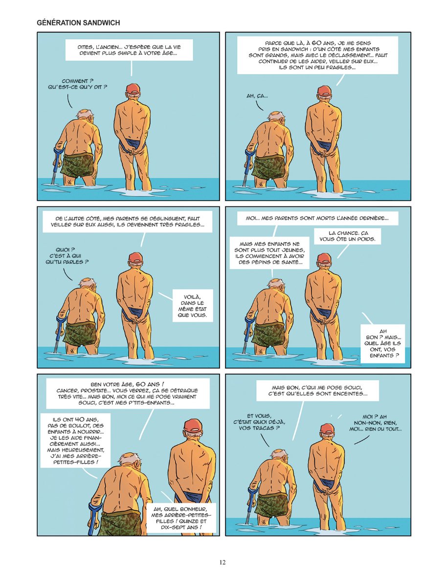 A l'aube de ses 60 ans, le prolifique auteur complet Jim réalise un album en solo sur ce passage fatidique tant redouté par un grand nombre de personnes ! Une page, un gag avec un dessin minimaliste vraiment centré sur les protagoniste en place. Il avait déjà utilisé l'itération iconique dans Le chant du cygne (Anspach) qui consiste à utiliser la même illustration avec parfois des zooms ou des cadrages différents, pour amener progressivement au dénouement. Cette méthode permet de se focaliser sur les dialogues qui eux changent bel et bien, comme le temps qui passe 😉 . Au cours de scènes du quotidien, il met en place deux ou trois personnes impliquées dans une discussion ou une situation liée à la soixantaine. Des thématiques comme la libido, l'apparence physique, la santé, les discussions intergénérationnelles, le travail, la famille, la place dans la société, il effectue un large tour d'horizon dans un ton libre finissant toujours par une chute humoristique. C'est un concept intéressant mais un peu trop répétitif pour moi, mais nul doute que les lecteurs(trices) conquis par Le chant du cygne y trouveront leur compte. Cela reste in fine profondément humain et juste, on a tous et toutes connus des situations de ce genre et certain parmi nous sont même peut-être déjà dans cette catégorie d'âge 🙂 . L'auteur finit par une explication sur son choix d'aborder ce sujet et il emprunte pour conclure une magnifique citation de Matisse : " On ne peut pas éviter de vieillir... essayons au moins d'éviter de devenir vieux" C'est tellement vrai !