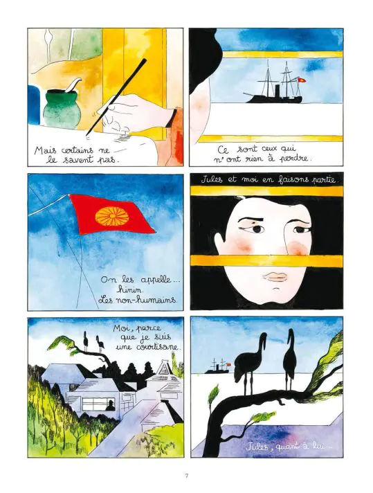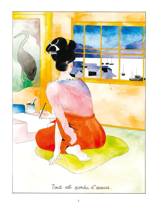 Collaborateur de Bastien Vives sur la reprise de Corto Maltese (Casterman), Martin Quehen délivre ici un scénario prenant où romance et violence se croisent ! Nous suivons le récit de Shizuka, une prostitué japonaise narrant la vie de Jules vivant en France. En suivant le parcours de vie chaotique de Jules, on va comprendre peu à peu comment ces deux destins éloignés de milliers de kilomètres vont se croiser et s'aimer ! Jugé pour un crime qu'il n'a pas commis, Jules est condamné à mort, sa seule échappatoire étant la légion étrangère, il accepte et va peu à peu découvrir le monde qui l'entoure. Des guerres au Mexique puis au Japon sous l'ère Edo marquant la volonté du pays de s'ouvrir aux occidentaux et aller vers le modernisme, Jules connaîtra l'horreur des champs de bataille sur tous les fronts ! Dans ce nuage sombre de violence, une éclaircie va peu à peu illuminer sa vie et son destin : la rencontre de Shizuka. Ces deux écorchés vifs que la vie n'a pas gâté, vont s'aimer passionnément et découvrir peu à peu une autre raison de vivre. Il faut s'accrocher à cette histoire qui mérite vraiment le détour, et pour cela, il est nécessaire d'accepter le trait rond et simple à l'aquarelle de Antoine Cossé. On pense à des estampes sur papier Canson de prime abord, avec des couleurs pétantes, mais cela concerne les premières pages, le thème s'assombrissant ensuite avec la vie de Jules, il adapte son choix de couleurs pour une réelle immersion. On est clairement dans du roman graphique et cela pourrait décontenancer les amateurs de BD plus traditionnelles, mais il faut persévérer dans la lecture pour mieux apprécier son trait subtil et expressif. D'autant que l'histoire est maîtrisée et prenante à plus d'un titre. On voyage aux côtés de Jules vers un pays au soleil levant synonyme de promesses et de rédemption, pour une histoire d'amour passionnante et passionnée ! Vous comprendrez bien mieux en fin de lecture le sens du titre 😉