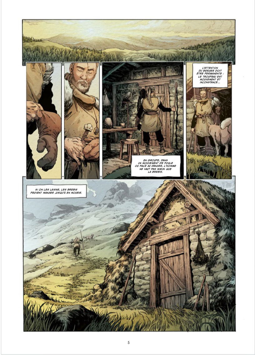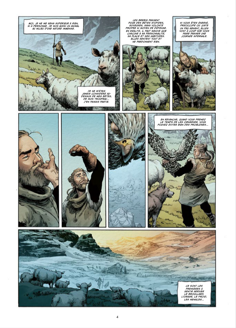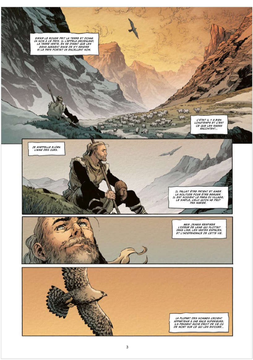 Quelle bonne idée du jeune éditeur Oxymore de récupérer le scénariste Christophe Bec de la distinguée concurrence Soleil 🙂 Il nous offre un splendide voyage en "Terre verte" aux côté d'un viking attachant en la personne de Björn ! On commence cette histoire à ses côtés dans les pâturages de cet immense territoire découvert et colonisé aux alentours de 988 ap JC par Erik le rouge. Environ 300 ans plus tard, la colonie s'étiole, victime du climat rude, d'un manque de ressources et d'échanges avec les pays alliés. Dans ce contexte difficile, Björn vit paisiblement avec ses brebis, son chien et son faucon, ne gagnant que rarement le village voisin pour y vendre ses fromages. Une vie de quiétude lui convenant parfaitement pour tenter d'oublier son passé de guerrier et les batailles auxquelles il a pris part. Mais cette communion avec la nature prend fin lorsqu'il découvre son troupeau entièrement massacré un beau matin ! Au milieu de ce désastre, d'étranges et gigantesques traces de pas, bien plus grosses qu'un ours blanc ! Il regagne la colonie pour y découvrir un contexte local précaire et une population au bord du gouffre, en proie à une possible menace des inuits. Droit du sol, religion, rituels nordiques, un soupçon de fantastique et vous aurez une remarquable histoire prenant son temps tout en vous tenant en haleine ! Un scénario parfaitement maîtrisé ainsi qu'un dessin que Bec lui même n'aurait pas renié, tant la griffe de Przemyslaw Klosin est proche de son travail ! Un trait réaliste, précis et détaillé jouant avec les perspectives et formidablement mis en couleurs par Julia Pinchuk. Ce dessinateur connait bien les univers "viking" pour avoir déjà travaillé sur la saga Jylland (Anspach), il réitère ici sa maestria et vous régalera de ses planches aérées et cinématographiques. Un premier tome des plus réussis, pour une histoire en deux albums, il me tarde déjà de lire la suite 🙂