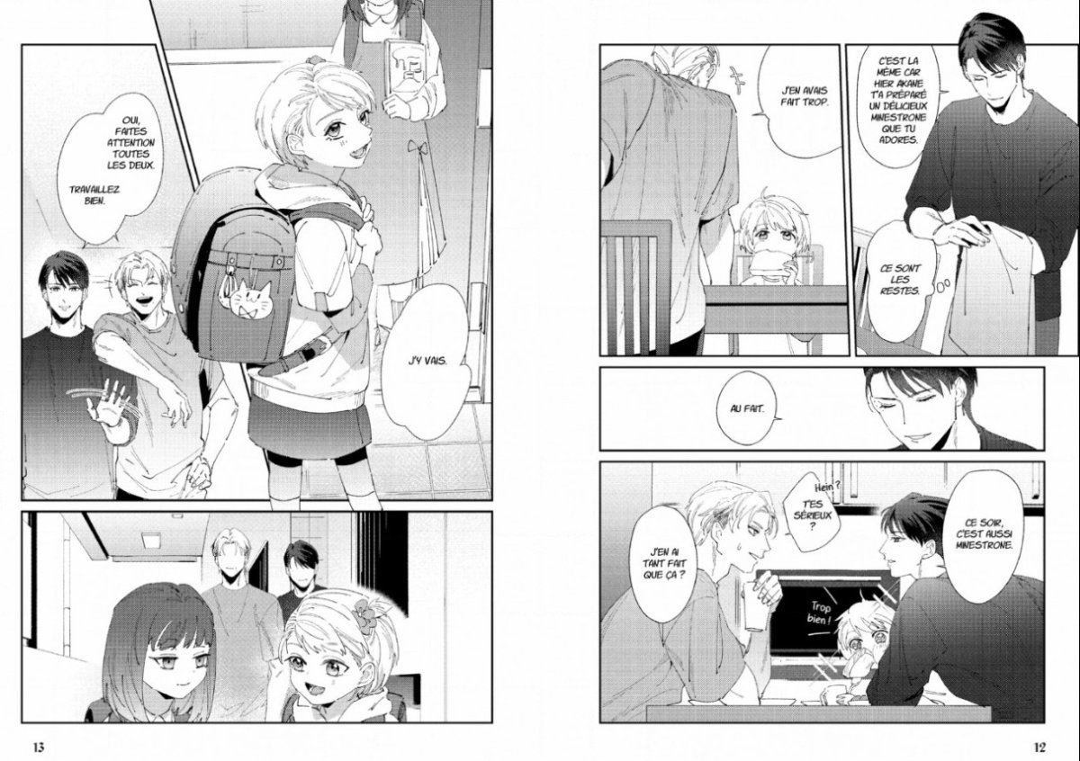 Autant dans laisse-moi te détester, on a une histoire équilibrée entre les histoires d’adultes et les histoires de famille avec les enfants. Dans cet omegaverse, la pauvre Shima n’apparaît qu’au début et à la fin du livre, tout le reste est un retour dans le passé racontant la rencontre entre ses deux papas.