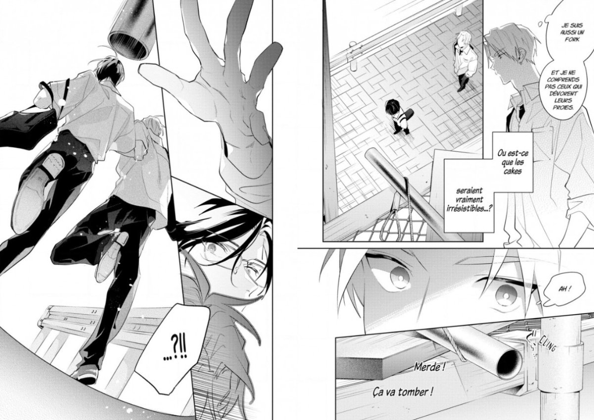 Ah voici un nouveau sous genre du yaoi que je ne connaissais pas : le cake-verse !! S’il est bien question de goût et de repas, cela n’a pas vraiment de lien avec la gastronomie. Dans l’univers du cake-verse, il y a des humains normaux, des forks et des cakes ; pour ceux qui ne parlent pas anglais, des « fourchettes » et des « gâteaux », alors forcément, les premiers vont aller dévorer les seconds au sens coquin du terme.