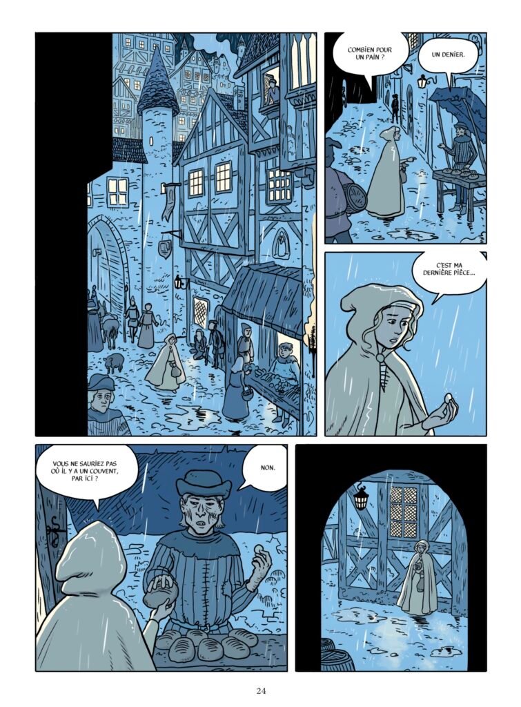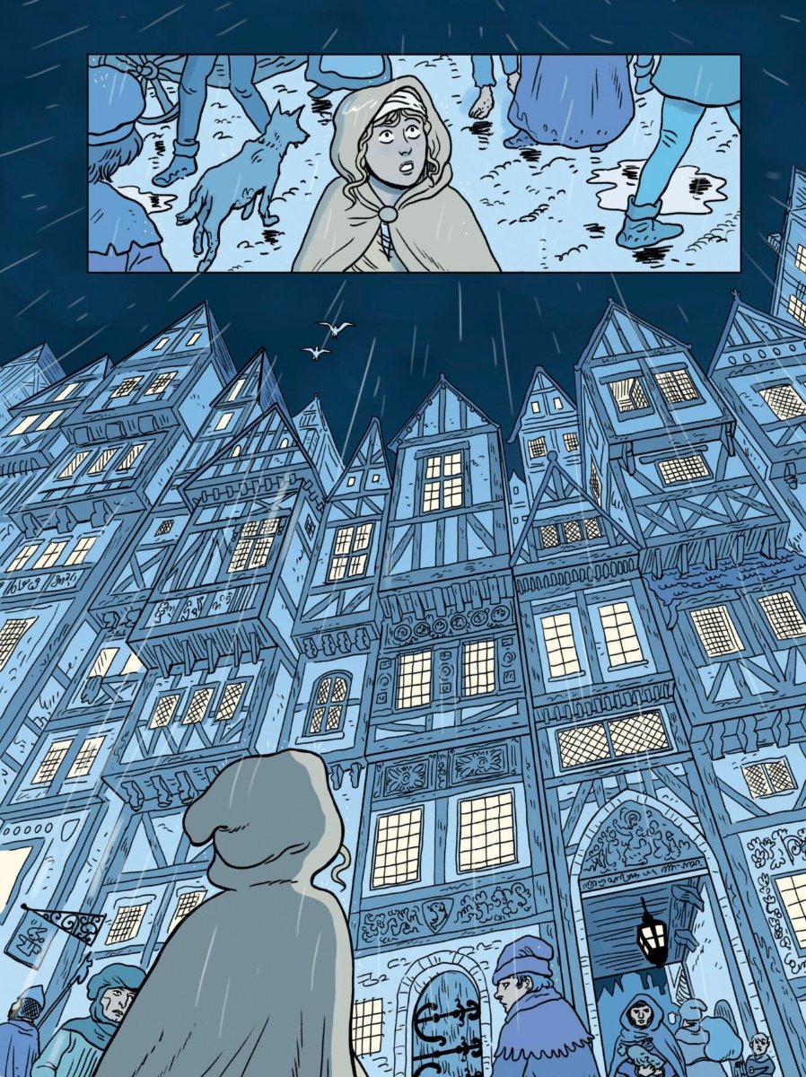 Côté visuel (planche ci dessous), l'auteur Pierre Alexandrine, dont c'est ici le 1er roman graphique, est sur un style clair avec une coloration un peu flashy. On est loin du dessin réaliste, il n'y a pas de passage gore mais ça correspond bien à cette chronique. Les décors ont beaucoup de détails et on est assez souvent sur des fresques historiques avec des grandes cases.