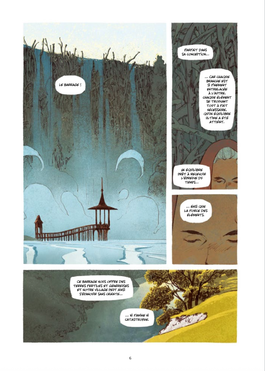 Oh que voilà une jolie histoire de transmission et d'aventure aux côtés de la très expérimentée Présentine Ramondore ! Un prénom évocateur au sein d'une société qui en a oublié la saveur, bien à l'abri de ce barrage à la confection presque magique tant il semble impensable qu'il tienne encore debout ! Le village de Présentine semble outre temps et dans une région reculée de type scandinave, mais sa particularité est d'être au pied d'un barrage de bois assemblés selon un ordre précis et presque magique. La moindre brindille a son utilité et son simple retrait serait aussi préjudiciable qu'un autre morceau bien plus gros. De cette symbiose dépend la solidité du barrage ! Présentine entretient cette légende et le respect immuable que les habitants doivent observer à l'édifice. Mais comme toute légende, le temps balaye tout sur son passage et les croyances d'hier ne sont plus aussi tenaces aujourd'hui, surtout quand elles sont incarnées par une vieille dame reclus dans sa cabane à l'écart des autres. Quand on ne croit plus en rien, ce mur de branches peut-il encore tenir ? Très belle histoire que nous conte Harold Charre, au sein d'un univers splendide fait d'étendues vertes et de montagnes ! Le dessin se met au diapason d'un scénario bien plus riche qu'il n'y paraît ! De planches à l'économie de détails selon le contexte, on peut passer à d'autres extrêmement précises et dotées d'une belle profondeur de champ. Cela tombe bien avec ces paysages divers tels que les forêts, les lacs prisonniers des reliefs de ces montagnes vertigineuses aux sommets enneigés. Une très belle leçon de vie qui se relira avec plaisir !