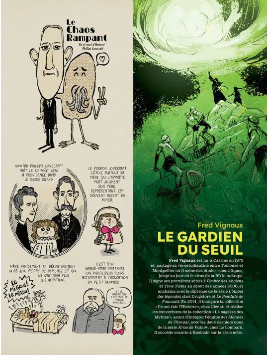 A l'occasion des "presque" 50 ans des humanoïdes associés (ce sera l'année prochaine) , l'équipe éditoriale prépare de nombreuses surprises . Ce 12 ème opus du trimestriel Métal hurlant célèbre un auteur incompris de son vivant , mais idolâtré bien des années plus tard , au début des années 80 avec la sortie d'un jeu de rôle pas comme les autres : L'appel de Cthulhu . Rappelons qu'absolument aucun livre relié n'est sorti durant sa vie , il ne s'agissait que de nouvelles parues ça et là au gré des petits éditeurs locaux dans les fameux "weird tales" . Dans ce volume , vous découvrirez entre les pages BD des interviews , comme celle du créateur du jeu de rôle ou encore l'illustrateur François Baranger , mais aussi de petites scénettes humoristiques en guise de biographie du romancier fantastique . Elles marquent les grands événements de sa vie , marquée par la solitude , l'incompréhension et la dépression . Contemporain de Robert E. Howard le créateur de Conan le barbare (entre autres) , lui aussi initiateur de mondes fantastiques et de récits épiques , Lovecraft a emprunté un tout autre chemin mâtiné d'obscurité et d'épouvante . De savoureuses pages de reportages et anecdotes sur sa vie vous attendent , les amoureux du romancier seront comblés ! Et la BD dans tout ça me direz-vous ? De grands noms sont venus y poser leurs pattes (ou tentacules) : Munuera , Guérineau, Daniel Hansen , Eldiablo , Lolita Couturier (étoile montante des Humanos) , Jorg de Vos ,et tant d'autres ayant travaillé déjà sur le trimestriel auparavant . Une multitude d'auteurs talentueux avec chacun leur vision du maître de l'horreur victorienne . Un regret pour moi : l'absence de Gou Tanabe qui sort ses adaptations des romans de Lovecraft avec un talent inouï chez l'éditeur manga Ki-oon . Les différents artistes traitent des récits de l'auteur avec plus ou moins de talent , y mêlant humour , vie personnelle , science-fiction , horreur , et bien-sûr de nombreuses références tentaculaires 😉 . C'est donc le début d'un chemin jalonné de fantastique que les Humanos prennent , en direction de 2025 et les 50 ans d'un éditeur ayant profondément changé le monde du 9ème art .