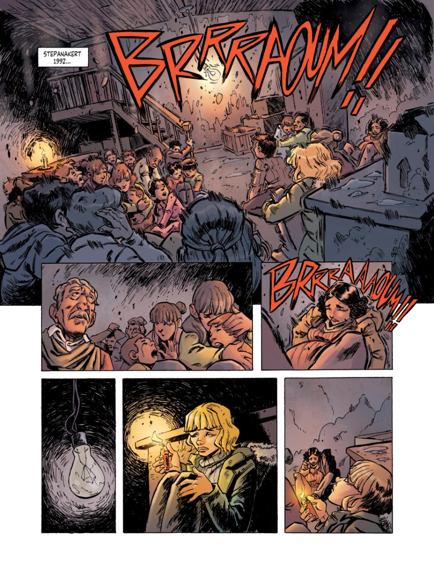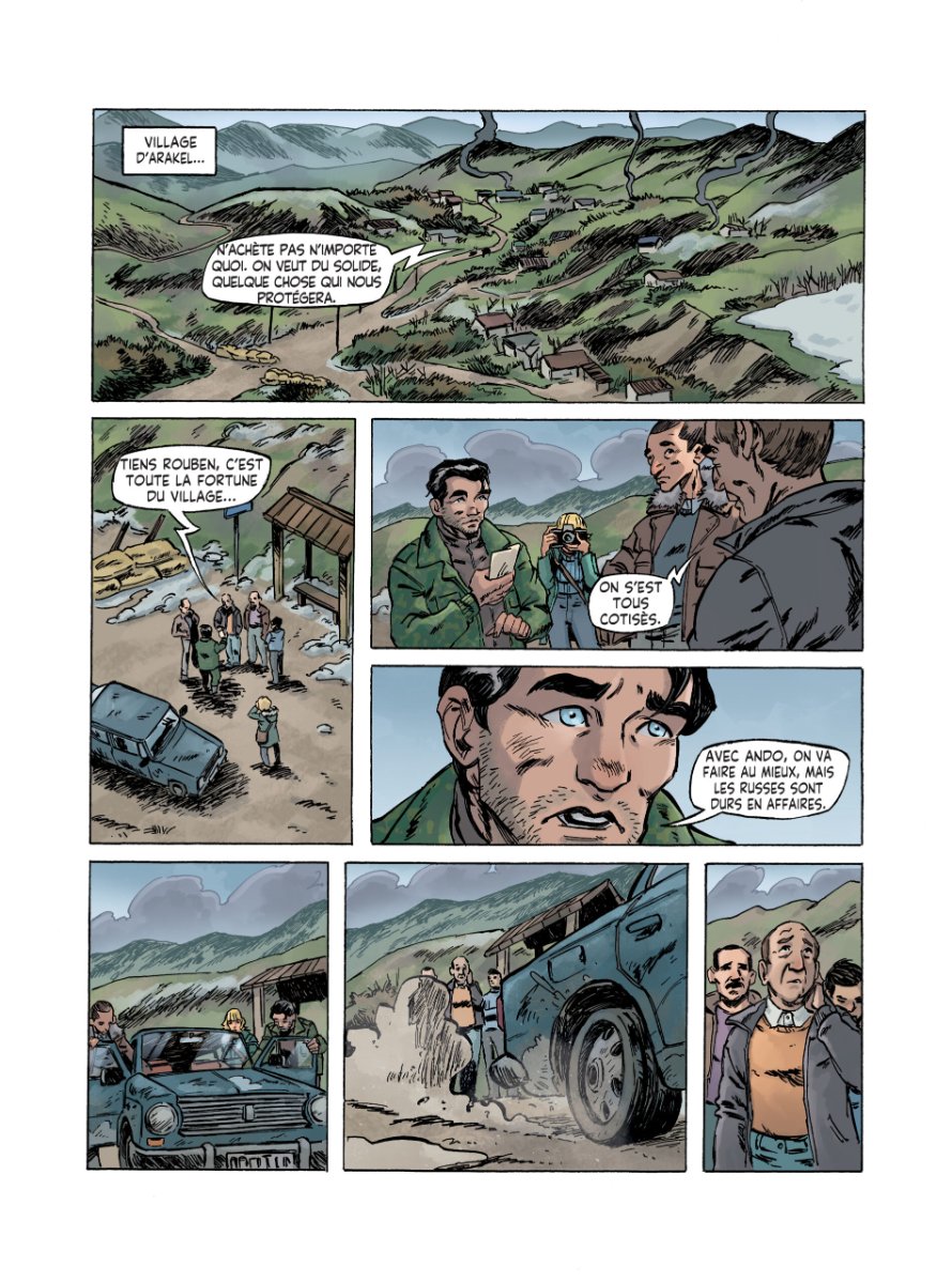 Le duo de scénaristes du remarquable Une histoire du génocide arménien (Petitàpetit) reviennent dans ces régions caucasiennes et plus précisément le Haut-Karabagh. A travers le parcours d'Elise la journaliste française sillonnant dans cette zone de conflit, les auteurs retracent l'histoire complexe de ces terres reculées. Ils abordent les périodes allant de l’Antiquité à l’actualité récente (2025), en passant par les conflits, les revendications identitaires, les guerres et les négociations géopolitiques qui ont marqué cette région montagneuse. Ils s'appuient sur des faits historiques précis, illustrant les origines anciennes de la présence arménienne dans la région, les influences successives des empires perses, ottomans, russes et soviétiques, ainsi que les tensions ethniques et religieuses entre Arméniens et Azéris. Les pages documentaires scindant le récit BD proposent cartes et illustrations aidant à visualiser les enjeux territoriaux, les déplacements de populations et les zones de conflit. La narration graphique met en lumière des symboles forts comme la sculpture "Nous sommes nos montagnes" (Mamik et Papik), devenue emblème de la résistance arménienne, ou encore les khatchkars (croix de pierre arméniennes), menacés de destruction. Un nouveau tour de force des auteurs, qui allient rigueur historique et engagement humaniste. Un album qui offre une plongée immersive dans l’histoire tragique et résiliente du Haut-Karabagh, tout en alertant sur les dangers actuels qui pèsent sur la population arménienne et son patrimoine. Un ouvrage essentiel pour comprendre les enjeux du Caucase et les défis de la mémoire collective.