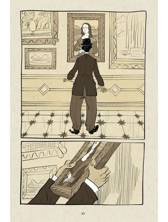 Quelle belle histoire que celle de Vincenzo Peruggia et ce braquage d'oeuvre d'art ! Mais pas n'importe laquelle s'il vous plaĂźt đ L'oeuvre mondialement connue situĂ©e au Louvres : la Joconde . Vous dĂ©couvrirez comment ce simple employĂ© du musĂ©e , ayant un poste subalterne va s'emparer du tableau et le conserver chez lui 2 ans , avant de vouloir le ramener dans son pays natal , l'Italie . Rocambolesque est le mot convenant le mieux Ă cette affaire mobilisant les plus hautes strates de l'Etat . Mais raconter juste le vol n'est pas suffisant pour faire une bonne histoire , et lĂ rĂ©side le talent du scĂ©nariste Marco Rizzo . Il explore Paris et la sociĂ©tĂ© française au dĂ©but du XX Ăšme siĂšcle . Ainsi cet immigrĂ© italien subit les quolibets et autres bassesses infligĂ©s par des supĂ©rieurs se considĂ©rant plus français que lui . L'auteur ajoute un collĂšgue de travail d'origine africaine pour amplifier ce sentiment de rejet de la sociĂ©tĂ© , car lui aussi subit des remarques peu avenantes . Cette mise en Ă©cho Ă la vie actuelle , donne au rĂ©cit de la modernitĂ© et l'ancre dans le rĂ©el .On dĂ©couvre aussi les conditions de vie assez misĂ©rables pour ces travailleurs dont le salaire suffisait Ă peine . Cela existe toujours plus de 100 ans aprĂšs ... Quand le tableau a t'il Ă©tĂ© rĂ©cupĂ©rĂ© et dans quelles circonstances ? Il vous faudra parcourir les trĂšs belles pages de Lelio Bonaccorso pour le dĂ©couvrir đ . Son trait est clair , simple et Ă©lĂ©gant . Il donne des tonalitĂ©s de beige Ă son noir et blanc , et dessine le hĂ©ros tel un Charlie Chaplin dĂ©passĂ© par son geste . Les visages sont expressifs et le mouvement perceptible Ă souhait . Il n'hĂ©site pas Ă dĂ©couper le gaufrier en 3 cases ou 2 selon ses envies , voire en double page , tout ceci amĂšne un dynamisme rendant la lecture passionnante . Pourquoi en revanche ne pas avoir optĂ© pour un format type "fumetti" (plus large que haut) au dĂ©triment d'une Ă©dition de taille "comics" ? Plus un dĂ©tail qu'un dĂ©faut assurĂ©ment . L'ouvrage est pourvu en fin d'album de portraits de la Joconde "vue par" de grands artistes , ainsi que d'anecdotes sur son histoire au musĂ©e . Une explication sur la rĂ©alisation de cet album par Marco Rizzo finalise cette trĂšs belle aventure .