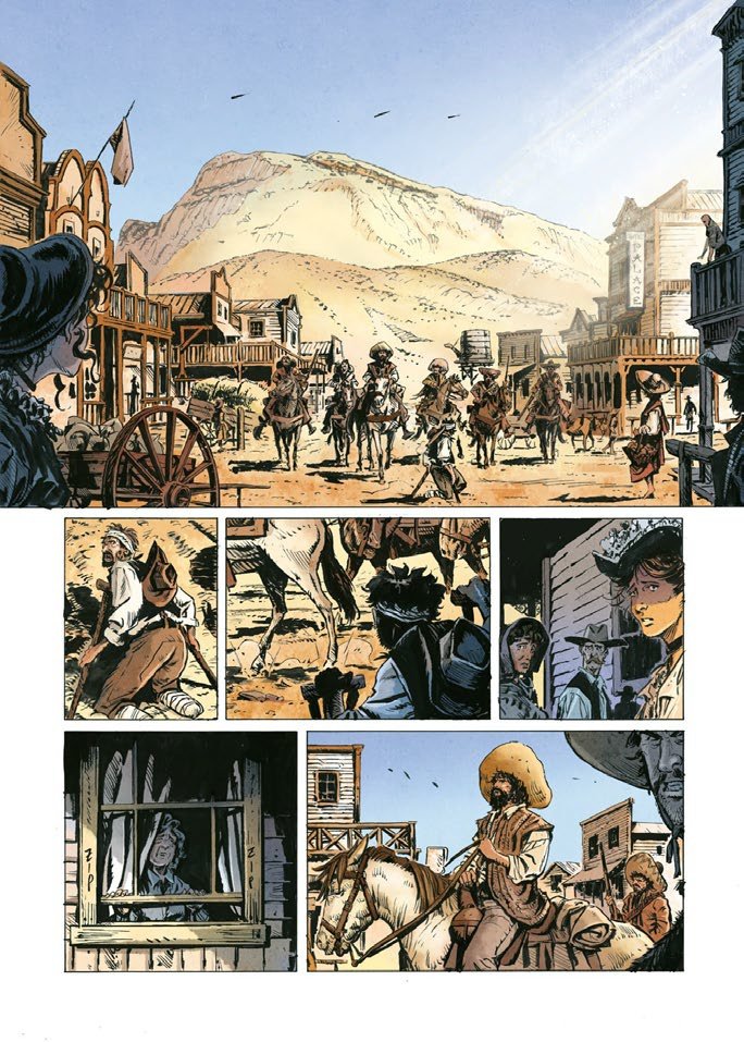 Prévue en trois tomes, cette série western nous promet d'ores et déjà de nombreuses révélations tant le scénariste Christophe Bec distille des pistes narratives secondaires au sein de l'histoire centrale. Tant est si bien qu'on se demande où se situe la trame principale parfois, entre l'enlèvement de l'institutrice par ce curieux mexicain Jésus Blanco le révolutionnaire, cette même professeure qui semble cacher de nombreux secrets, mais aussi le shérif local dissimulant son passé, un Texas ranger métis redresseur de torts lui aussi au lourd passif et enfin un curieux personnage arrivant en ville en même temps que le ranger nous gratifiant de monologues et dissimulant ses intentions. La traque s'organise pour arrêter le révolutionnaire et sa cohorte, sans oublier l'institutrice à sauver, nos deux protagonistes crapahutent dans le désert rocailleux en quête de pistes. C'est un peu nébuleux pour le moment et c'est tant mieux 🙂 . Le scénariste nous balade sans trop en révéler, nous saurons vite au fil des tomes suivants ce qu'il nous réserve ! Pour illustrer ce western, il s'entoure de l'artiste italien Germano Giorgiani qui réalise des planches soignées et détaillées, le tout dans un style réaliste correspondant parfaitement au contexte de l'ouest sauvage américain. Les personnages sont facilement reconnaissables au sein de cette galerie élargie et prometteuse, avec des décors typiques de désert et formations rocheuses agrémentées de cactées tutoyant le ciel. Sandrine Cordurié assure la colorisation avec le talent qu'on lui connaît sur ses travaux dans une autre saga estampillée "western" : West legends (Soleil) . Les ambiances sont fidèlement retranscrites, la chaleur du désert aux notes de rouge chatoyant, mais aussi les nuits fraîches teintées de bleu, le tout embelli par une belle lumière mettant en avant le dessin. Un bon premier tome annonciateur de rencontres et révélations nombreuses par la suite !