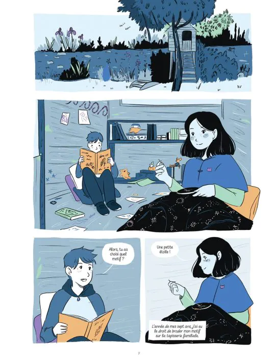 Sous ses airs de BD jeunesse avec un graphisme rond et simple, cette histoire va vous surprendre. On s'égare parfois dans cette grande galerie de personnages, certains sont les mêmes mais ont évolué différemment dans l'autre univers. Elle nous aide en donnant des ambiances spécifiques dans chacun. Ainsi le sépia prédomine dans le présent ou monde des tisseuses, alors que le bleu caractérise le passé, le monde des gardiennes. A travers cette histoire qui prend des allures de romance, l'auteure pose des questions sur le libre arbitre, les regrets et l'infini des possibles ! Une lecture intéressante qui mérite que l'on s'y attarde voire que l'on s'y remette car complexe au demeurant 😉