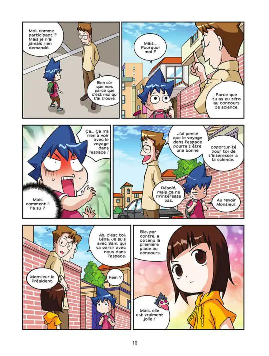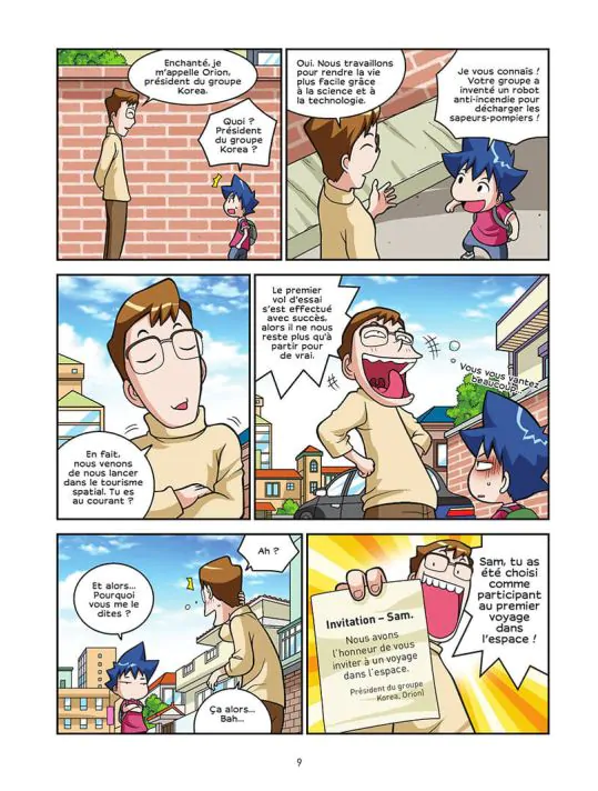 Kevin Nivek Posté(e) le 1 janvier 2024 Share Posté(e) le 1 janvier 2024 Titre de l'album : Tout savoir en BD - L'univers Scenariste de l'album : Bombom Story Dessinateur de l'album : Choi Woo-Bin , Lee Jungtae Coloriste : Editeur de l'album : Jungle Note : Résumé de l'album : Tout savoir en BD , une série pour informer de façon ludique la nouvelle génération à propos des sciences humaines et naturelles. Sam a obtenu une mauvaise note lors d'un concours scientifique et se voit offrir un voyage dans l'espace par Orion, le président de Korea Group. Surpris, Sam ne comprend pas ce qui lui arrive, Orion lui explique que ce voyage est une opportunité pour lui de s'intéresser davantage aux sciences. Sam et son amie Léna s'entraînent alors pour partir dans l'espace et montent finalement à bord du vaisseau spatial. Arrivés dans l'espace, le président Orion, Sam et Léna explorent diverses planètes du système solaire. Ils commencent par apprendre les principes de la rotation de la Terre et de la Lune, puis la structure du Soleil et les caractéristiques d'autres planètes comme Jupiter, Mars et Saturne. Ils découvrent aussi la vie des étoiles dans l'Univers. Critique : Après un premier opus sur le monde des dinosaures , les auteurs coréens nous entrainent vers l'infini et l'au delà , si vous me permettez l'expression 🙂 . A la lecture très enrichissante de cette aventure spatiale , on pense aux mots de la devise des explorateurs de la série tv Star Trek : « Espace, frontière de l'infini vers laquelle voyage notre vaisseau spatial (...) " Nos deux explorateurs en herbe Léna et Sam , ont l'occasion de poser 2001 questions sur l'odyssée spatiale et la formation du cosmos . Des premiers vols spatiaux , à la création d'un trou noir , en passant par chacune des planètes de notre système solaire , vous saurez tout ! Un vocabulaire adapté pour une compréhension par le plus grand nombre de profanes, dont je fais partie , est la recette qui fonctionne pour ce genre de documentaire . Le style graphique "manga" avec les poncifs habituels humoristiques si caractéristiques ,peut en rebuter certains , mais là n'est pas l'objet de ce docu-bd . La construction des découvertes est réussie avec des schémas et autres images d'archives ponctuant le récit . On passe de Mars à Saturne avec l'envie d'en découvrir d'avantage . Une belle réussite , pour autant que le sujet vous intéresse 😉 Les prochaines sorties en février 2024 porteront sur le corps humain , et la Terre . Autres infos : Type de l'album : BD Europeene Lien BDfugue : https://www.bdfugue.com/l-univers/?ref=44 Voir la totalité de enregistrement Citer Lien vers le commentaire Partager sur d’autres sites More sharing options...