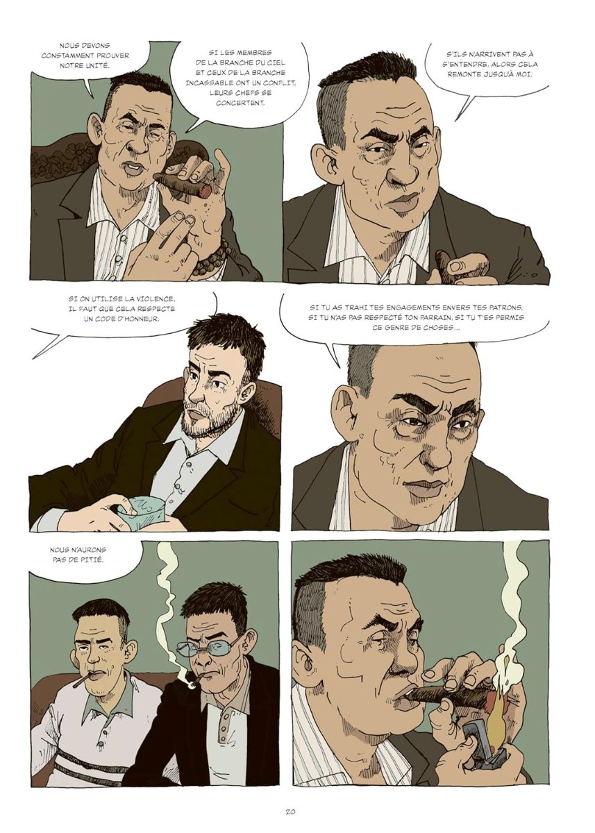 Kevin Nivek Posté(e) le 30 septembre Share Posté(e) le 30 septembre Titre de l'album : Les Triades Scenariste de l'album : Antoine Vitkine Dessinateur de l'album : Christophe Girard Coloriste : Muge Qi Editeur de l'album : Steinkis Note : Résumé de l'album : Enquête au coeur des Triades, l'organisation criminelle la plus puissante au monde. Considérées comme les plus puissantes organisations mafieuses au monde, les triades chinoises sont entourées de mystère. Pendant des mois, Antoine Vitkine a interrogé des membres de ces mafias, depuis des soldats de base jusqu'à d'influents parrains, mais aussi des repentis, des policiers,des agents de renseignement... Un album pour comprendre l'influence des triades sur la géopolitique et l'économie mondiale, jusqu'en France, et leur rôle dans certaines des crises de notre époque. Critique : La section "témoins du monde" de l'éditeur Steinkis s'enrichit d'un nouveau documentaire passionnant sur la mafia chinoise avec "Triades, quand la mafia chinoise parle" . On retrouve une partie de l'équipe ayant réalisée le formidable "MBS, l'enfant terrible d'Arabie saoudite" (Steinkis) avec Antoine Vitkine à l'écriture et Christophe Girard au dessin. Le récit alterne phase d'interviews des membres des triades avec histoire et explications du contexte. La géopolitique s'invite ainsi au sujet car le XXème siècle a été riche en territoires occupés et libérés. Antoine Vitkine nous expose ses rencontres avec ces "barons" ayant eu mille vies, avec bien souvent le même schéma : pauvreté infantile, argent facile avec la mafia locale, ambition pour grimper les échelons, case prison, sortie ou pas de prison et reprise des activités illicites, évolution des affaires de la triade se tournant vers d'autres horizons. On peut dire que les triades se sont adaptées au monde environnant, à travers la présence importante d'expatriés dans les grandes villes occidentales (comme Vancouver) avec leurs quartiers "Chinatown" représentants une porte ouverte pour le trafic et une main d'oeuvre facile et accessible. Agissant telle une hydre où chaque tête perdue repousse, on les voit s'adapter aux fins de protectorats britanniques pour Hong-Kong et portugais pour Macao, le plus surprenant étant de constater leurs liens intimes avec le PCC (Parti Communiste Chinois) qui va savoir les utiliser aussi à ses fins pour influencer la population. Un pacte faustien donnant/donnant entre deux entités que tout oppose ! Une fois de plus, c'est une véritable mine d'informations croustillantes que nous livre l'éditeur pour qui veut parfaire ou améliorer sa culture générale et je dis bravo pour la mise en scène et l'accessibilité du récit. Autres infos : Type de l'album : Roman graphique Lien Partenaire : https://www.bdfugue.com/les-triades/?ref=44 Voir la totalité de enregistrement Citer Lien vers le commentaire Partager sur d’autres sites More sharing options...
