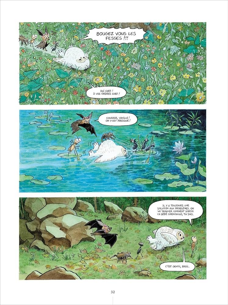 Kevin Nivek Posté(e) le 15 novembre 2025 Share Posté(e) le 15 novembre 2025 Titre de l'album : Au chant des grenouilles tome 4 - Le mystère de l'étang Scenariste de l'album : Barbara Canepa, Anaïs Halard Dessinateur de l'album : Kerascoët Coloriste : Kerascoët Editeur de l'album : Oxymore Note : Résumé de l'album : Le Club du Samedi se confronte à une nouvelle affaire délicate... Une maman grenouille, qui venait de transmettre l'art du camouflage à ses rejetons, a perdu la trace de l'un d'entre eux !... S'est-il égaré ? Ou, pire, quelqu'un l'aurait-il gobé ? Et si c'était cette pauvre Vanille ?... Tous les membres du club vont s'unir pour tenter de venir en aide à cette maman grenouille désemparée... Et Urania pourrait encore jouer un rôle précieux en leur apportant ses savoirs sur la magie et la nature... Critique : Après trois premiers tomes constituant un arc narratif autour du concours de pâtisseries, nos jeunes aventuriers du Club du samedi se retrouvent autour d'une enquête sur la disparition de Lime la jeune grenouille. Cette dernière apprenant à se camoufler avec sa mère a tellement bien réussi l'épreuve que des fourmis se sont emparées d'elle pour la mener dans leurs galeries souterraines. Lime parvient à s'échapper mais se perd dans la forêt ! Dans le même temps on suit les membres du club se réunissant autour de Vanille la chouette. Au fil d'une discussion elle ingère une boule de mousse en expliquant changer son mode alimentaire à ses camarades. Se pourrait-il que cette boule verte soit la jeune Lime ?? Lorsque la maman de la grenouille les interpelle car elle a perdu sa fille, la peur mêlée au mystère s'empare des jeunes aventuriers. C'est donc une histoire complète qui constitue cet album, idéale pour les nouveaux lecteurs et en bon complément pour les amoureux de cet univers animalier. On retrouve les thèmes abordés dans les tomes précédents avec la coopération, le mystère, ainsi qu'un soupçon de magie ; le tout avec une touche d’humour et de suspens adapté aux jeunes lecteurs. Des pages documentaires explicites complètent la lecture et donc aident à comprendre la résolution de ce fameux mystère de l'étang ! A noter la rupture visuelle avec un dessin plus onirique et ensorcelant de Kerascoët, qui sera nettement moins réaliste et naturaliste que les trois premiers tomes, cela peut plaire comme décevoir, à vos goûts et couleurs 🙂 Autres infos : Type de l'album : BD Europeene Lien Partenaire : https://www.bdfugue.com/au-chant-des-grenouilles-tome-4-le-mystere-de-l-etang/?ref=44 Voir la totalité de enregistrement Citer Lien vers le commentaire Partager sur d’autres sites More sharing options...
