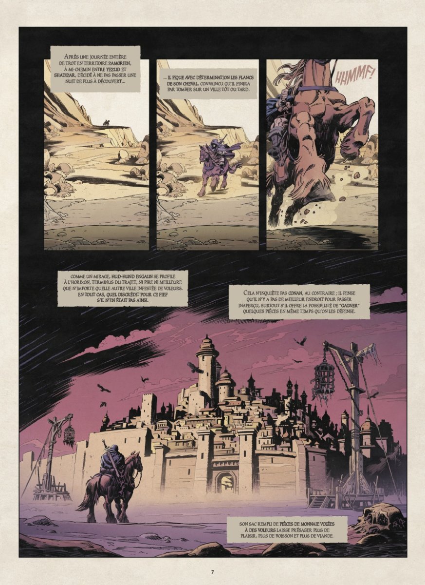 Kevin Nivek Posté(e) le 29 janvier Share Posté(e) le 29 janvier Titre de l'album : La bête du Nord - La cité des mensonges Scenariste de l'album : Oscar Martin Dessinateur de l'album : Leonel Castellani Coloriste : Editeur de l'album : Delcourt Note : Résumé de l'album : Dans cette aventure inédite, le Cimmérien qui n'est pas encore roi accepte une mission simple : délivrer la fille d'un chef de clan enlevée par un rival. Mais dans les ruelles fétides de Hud-hund Engaun, les apparences sont trompeuses... Epuisé par ses aventures, un puissant barbare arrive dans une ville frontalière en proie aux brigands de la pire espèce. Engagé pour sauver la fille d'un chef de gang au milieu d'une guerre de territoires, le guerrier solitaire pense accepter un contrat facile. Il se jette dans une conspiration mortelle. Plongé malgré lui dans ce nid de vipères, la "Bête du Nord" va devoir rappeler à ces criminels ce qu'est la véritable sauvagerie. Critique : Le duo de bienfaiteurs latins à l'origine du spin-off Solo Lyra (Delcourt) remet ça avec une libre adaptation des aventures du cimmérien le plus connu, j'ai nommé Conan ! En effet, Oscar Martin est passionné par ce personnage créé par Robert E. Howard en 1932 et plutôt que de refaire une histoire déjà contée, il imagine la sienne et ça va trancher dans le vif ! Le hasard mène le colosse dans la bourgade fortifiée de Hud-hun Engaun pour y trouver un refuge et éventuellement un travail rémunérateur. Très vite, une rixe éclate dans la taverne et ses talents n'échappent pas à un seigneur de la pègre locale. Il le missionne de retrouver sa fille, retenue captive par son adversaire direct détenant l'autre partie de la ville. Conan ira de surprises en surprises et le sauvetage prendra vite des allures de survival au fil de rencontres aux apparences trompeuses. Le sang coule, jamais le titre de "bête" ne lui aura aussi bien convenu ! La masse musculeuse déferle dans les palais et autres refuges des parrains locaux et laisse derrière elle membres découpés, têtes dans des sacs mais aussi son lot de secrets éventés ! Un scénario bien plus fin qu'une simple histoire de confrontation entre deux clans mafieux, avec au milieu un monstre sauvage déterminé à lever le voile et se remplir les poches. Leonel Castellani nous régale avec ses planches superbes, son passage d'un monde animalier (Solo) à des humains, démontre toute l'étendue de son talent ! La rage du barbare explose dans les scènes de batailles, les cases fourmillent de détails, le découpage est immersif au possible, on tourne les pages avec avidité 😉 . Les amateurs du cimmérien y trouveront forcément leur compte, les autres pourront découvrir ce qu'est réellement "la bête du nord" ! Autres infos : Type de l'album : BD Europeene Lien Partenaire : https://www.bdfugue.com/la-bete-du-nord-la-cite-des-mensonges/?ref=44 Voir la totalité de enregistrement Citer Lien vers le commentaire Partager sur d’autres sites More sharing options...