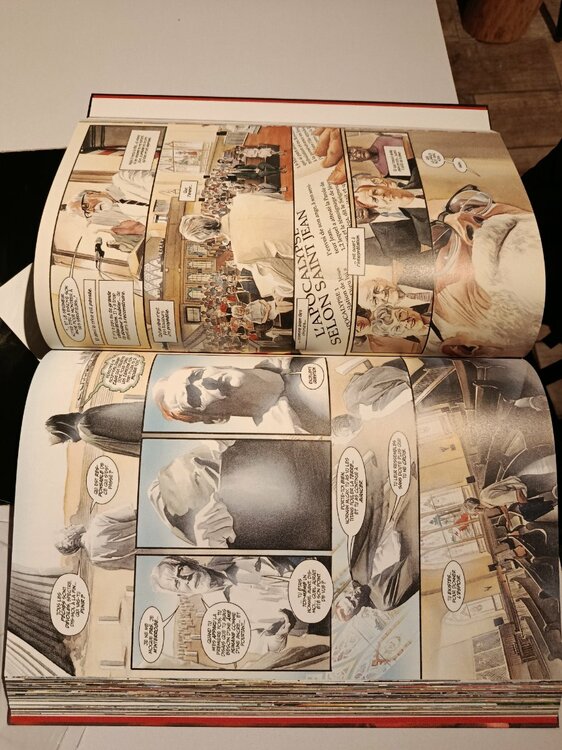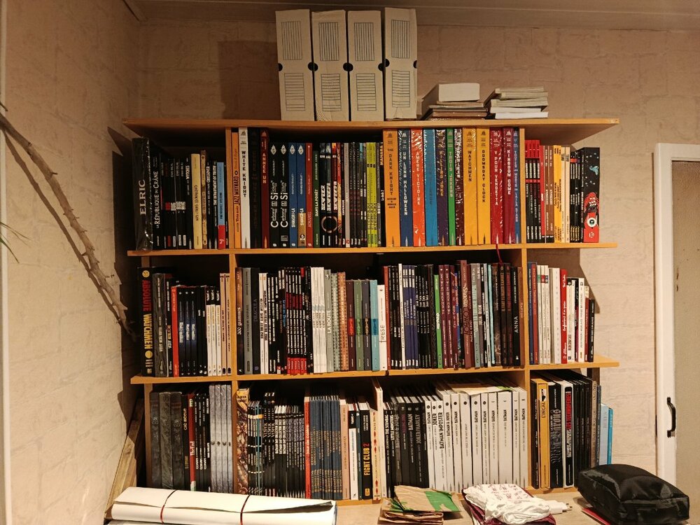 Bon j'arrive pas à éditer... Du coup je vais vous mettre mes dernières acquisitions (ça faisait longtemps que je n'avais pas acheté de BD 😅) En cadeau : - bug 4 - Elric 6 - silent jenny version canal bd En cadeau que je me fais : - kingdom come UL (c'est normal la paleur des dessins?) - dark knight UL - coffret intégral Blast (édition canal bd) Voilà ! Ha! Ça fait du bien!!! J'ai sorti mes bds qui étaient dans les cartons depuis Mai 2021!!! (Pas encore tout classé et meuble improvisé mais jsuis trop content !!!!). bon, il reste encore mes éditions grand format qui ne rentrent pas... Et ma collection de comics (Conan, gen13, wildcats, etc...), mais ce que ça fait du bien de retrouver ses BB 😁
