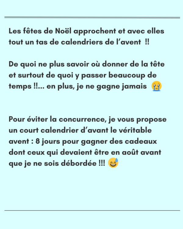 Bonjour Cette année, le calendrier de l'avent commence avant décembre pour ne pas se retrouver noyé dans le flots de tous les calendriers de l'avent qui vont arriver !! J'ai tenté l'expérience en story sur instagram et je n'ai eu aucune réponse 😥 Du coup, ça se passera en commentaires avec des réponses à la vue de tout le monde mais je n'ai pas trouvé mieux !!! Je pense laisser les questions ouvertes jusqu'à la fin de la première semaine de décembre pour vous laisser le temps d'y réfléchir