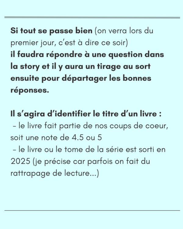 jusqu’àBonjour à tous Qui dit décembre dit forcément cadeaux ! Cette année on change de format, on fait un calendrier de l'avent sur instagram ! le concept est simple : - identifier une image (le titre de la série suffit, pas besoin du tome exact s'il y en a un) - invitez une ami à participez (sur instagram uniquement) - donnez la réponse en commentaire Le gagnant sera tiré au sort parmi les bonnes réponses et s'il n'y a pas de bonne réponse, il sera tiré au sort parmi les participants Comme je sais que certains ne sont pas du tout réseau sociaux, vous pouvez aussi participer sur le site, dans cette rubrique en laissant votre commentaire Indice : la série à trouver a forcément une note de 4 ou plus La publication a été mis en ligne sur instagram à partir de novembre 2024 (attention, les posts insta sont mis en ligne bien après la critique du site parfois, en tout cas cela ne concernera pas des critiques avant septembre) -