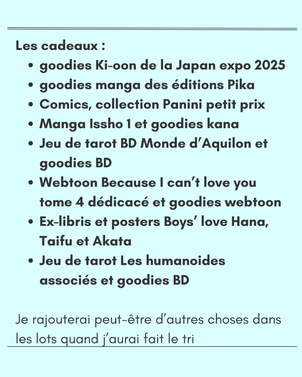 jusqu’àEn partenariat avec les éditions 1001Bd vous invite à participer à son jeu-concours Manga Chaque jour pendant 1 semaine, 4 images tirées de mangas vous seront présentées (28 images au total) : Vous trouvez la série : vous gagnez 1 point Vous trouvez le tome de la série (s'il y en a un) : vous gagnez 1 point supplémentaire Le formulaire de réponses sera disponible le dernier jour, soit le lundi 27 décembre 2021 et vous aurez jusqu'au lundi 3 janvier à 23H30 pour envoyer vos réponses (on vous laisse le temps de chercher !!) Celui qui obtient le plus haut score remporte le 1er lot et ainsi de suite, en cas d'égalité, la question subsidiaire vous départagera. Il y aura forcément des gagnants !! Pour participer, il vous suffit d'avoir un compte sur le site 1001bd, d'être majeur et de résider en France métropolitaine. Une seule participation par personne sera acceptée. 🎊 🎁 LOTS A GAGNER 🎁 🎊 Vous avez la possibilité de gagner les lots ci-dessous, il s'agit de tomes 1 ou one shot et de goodies Les goodies sont généreusement offerts par les magasins Le Furet du Nord de SQY Ouest et Joseph Gibert Versailles